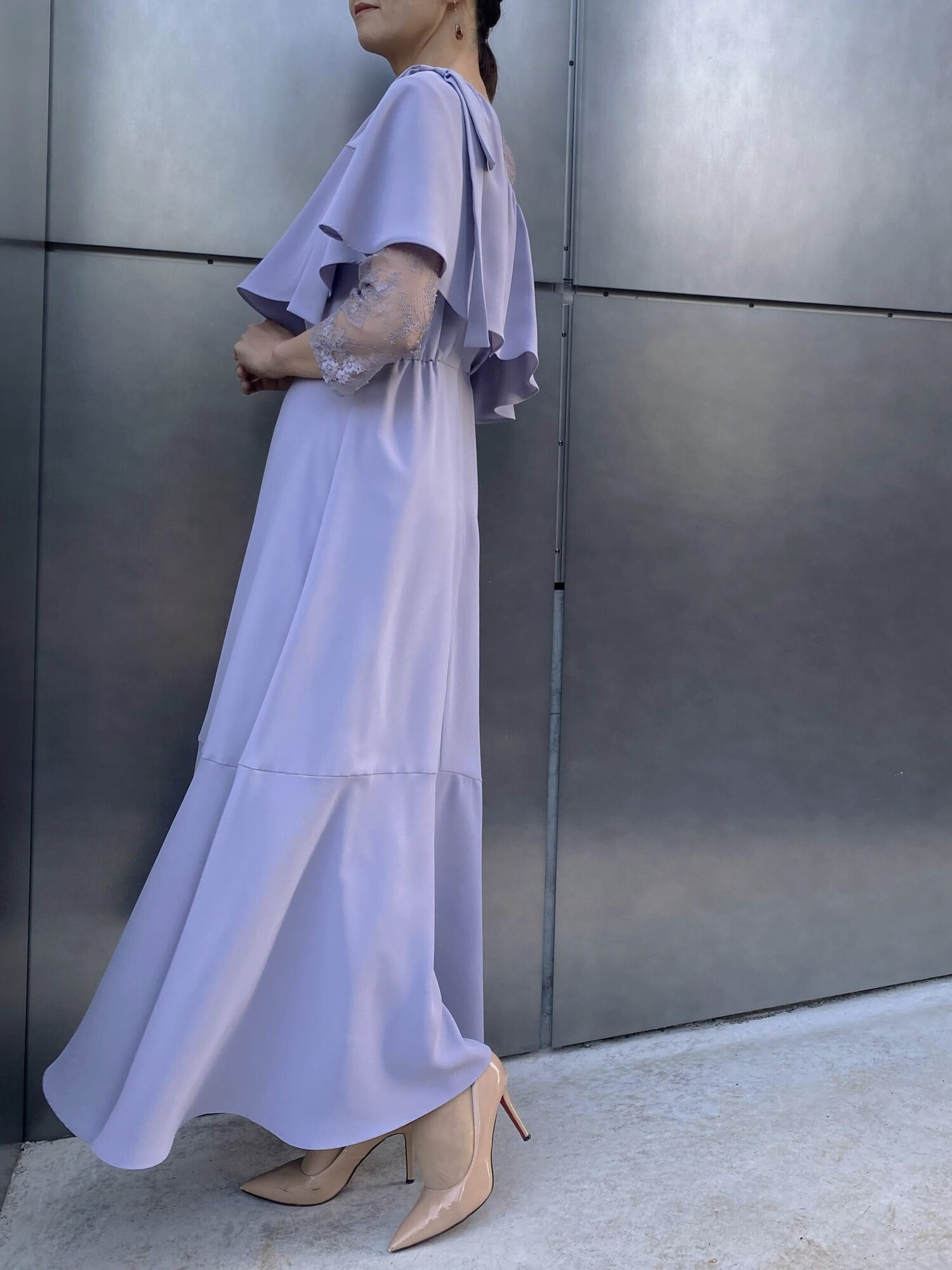 肩のストライプレースと360度、どこからみても綺麗なラッフルがデザインポイント