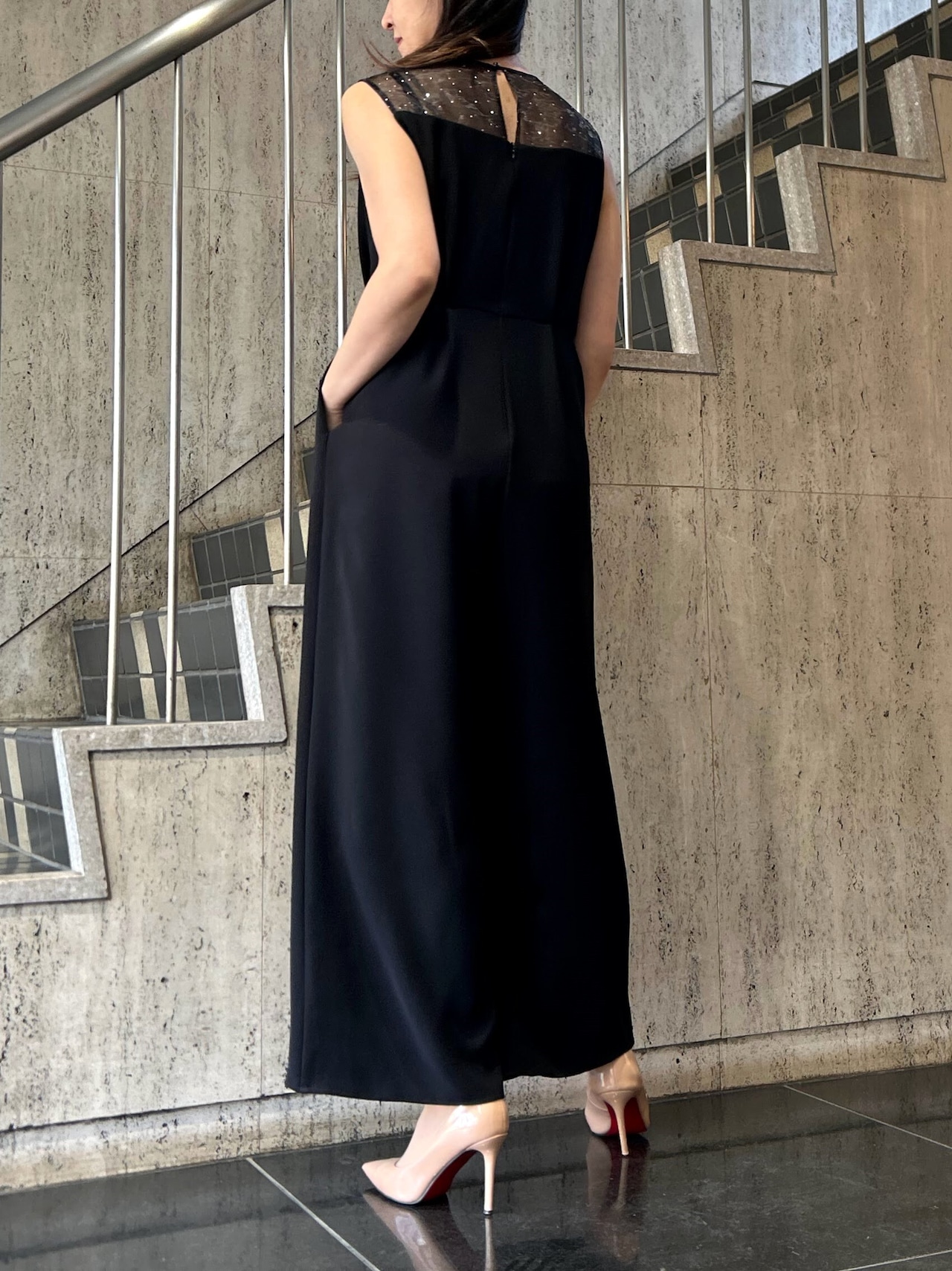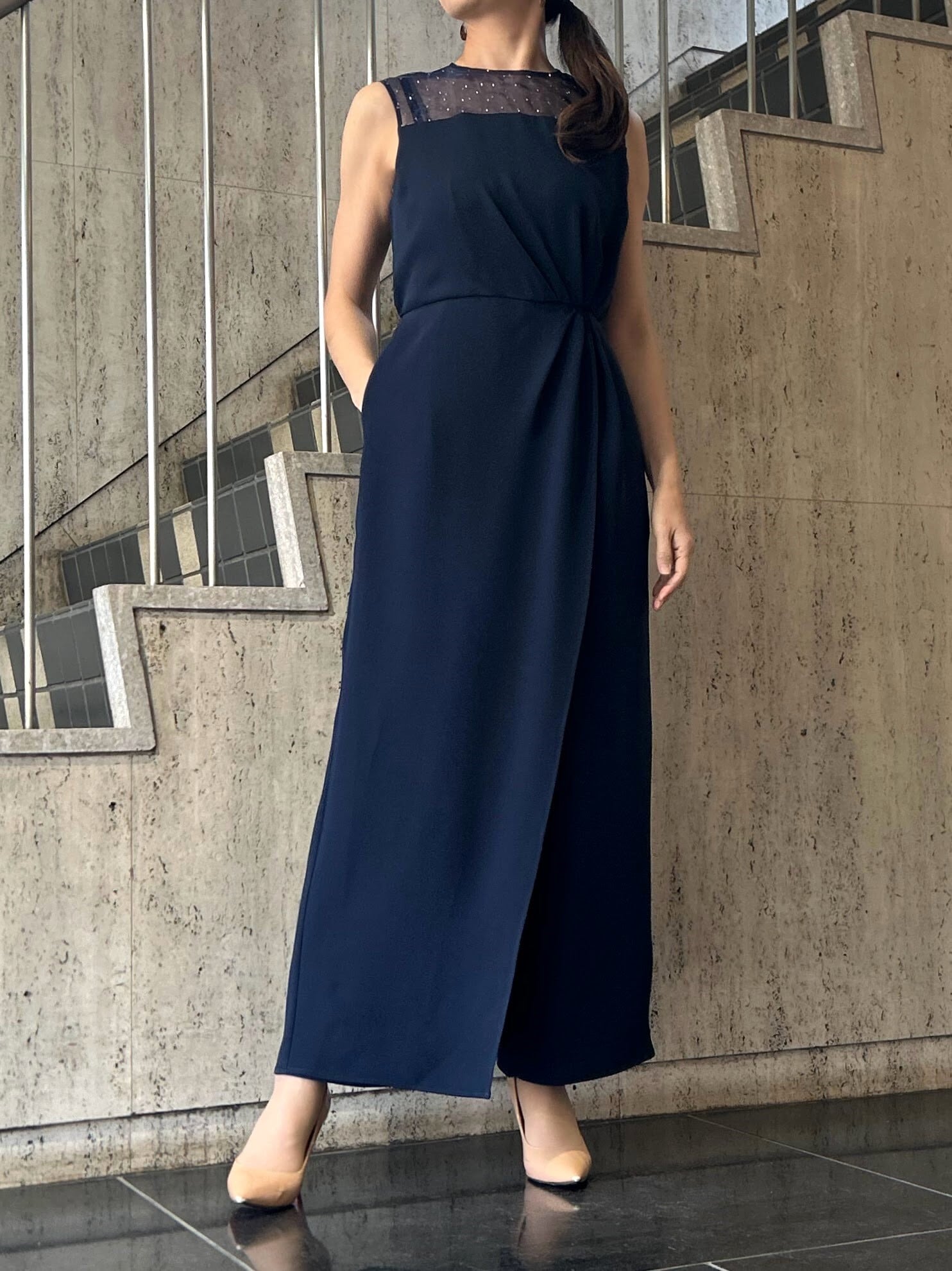 ドレープのラップデザインは、立ち姿はスカートに見え、また動きに合わせてアクティブ感もあるパンツドレスです。
