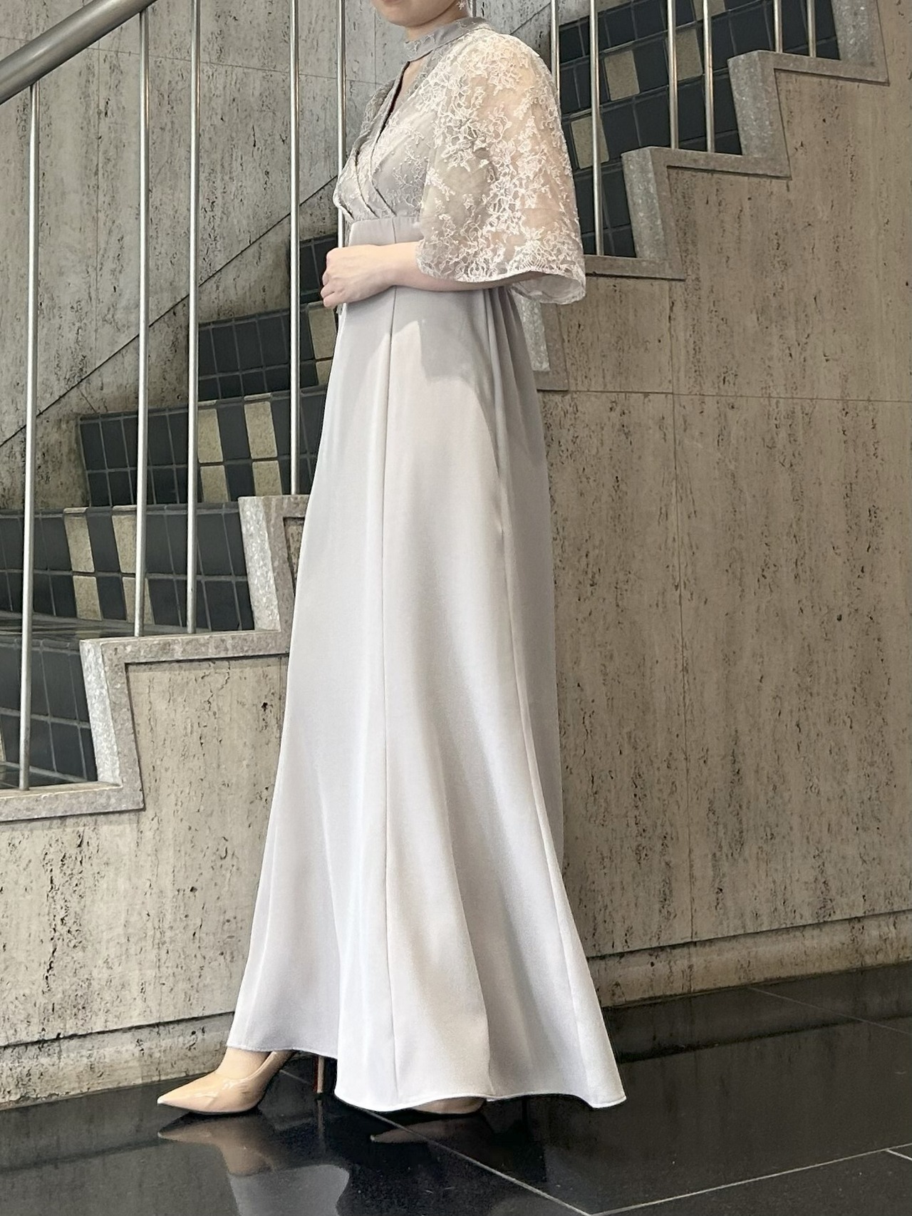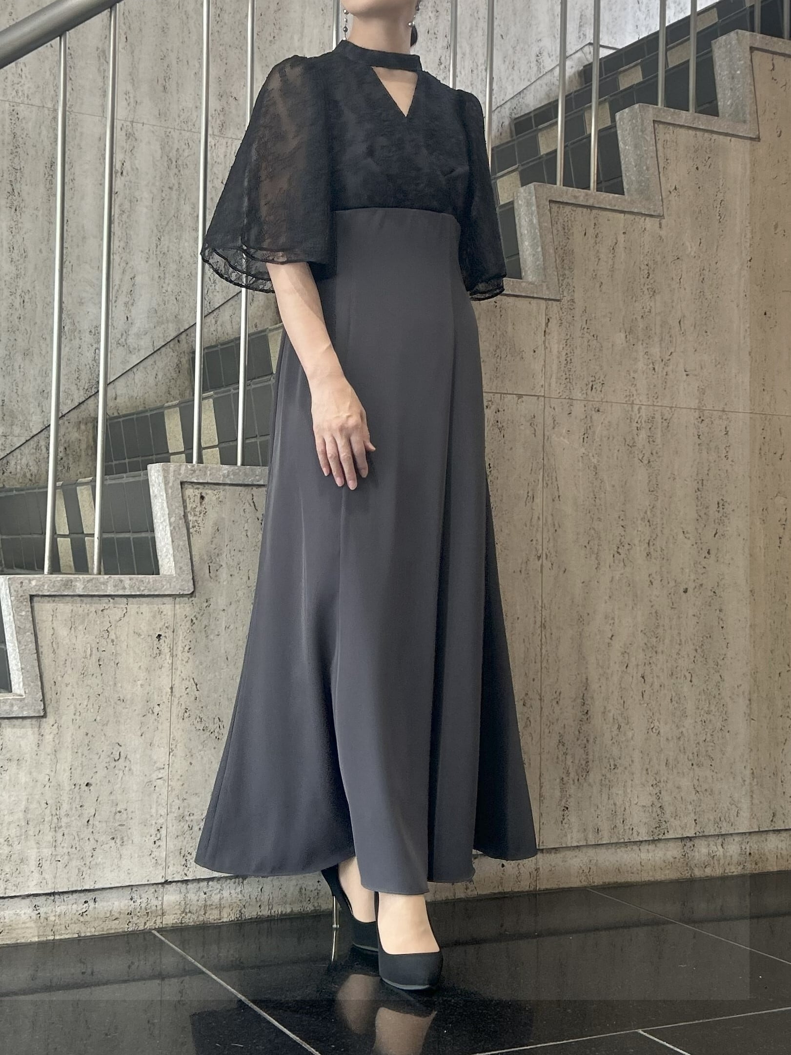 腰下を長く見せ、スタイルアップ効果のあるハイウエスト切替からのマーメイドシルエットがとても綺麗なロングドレスです。