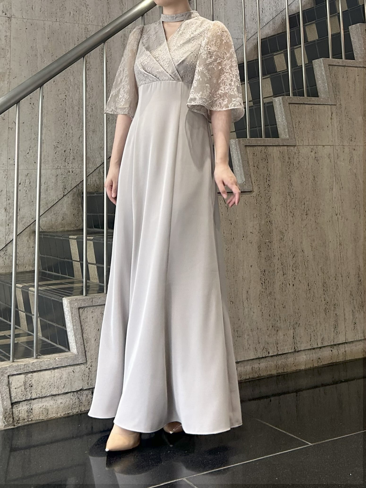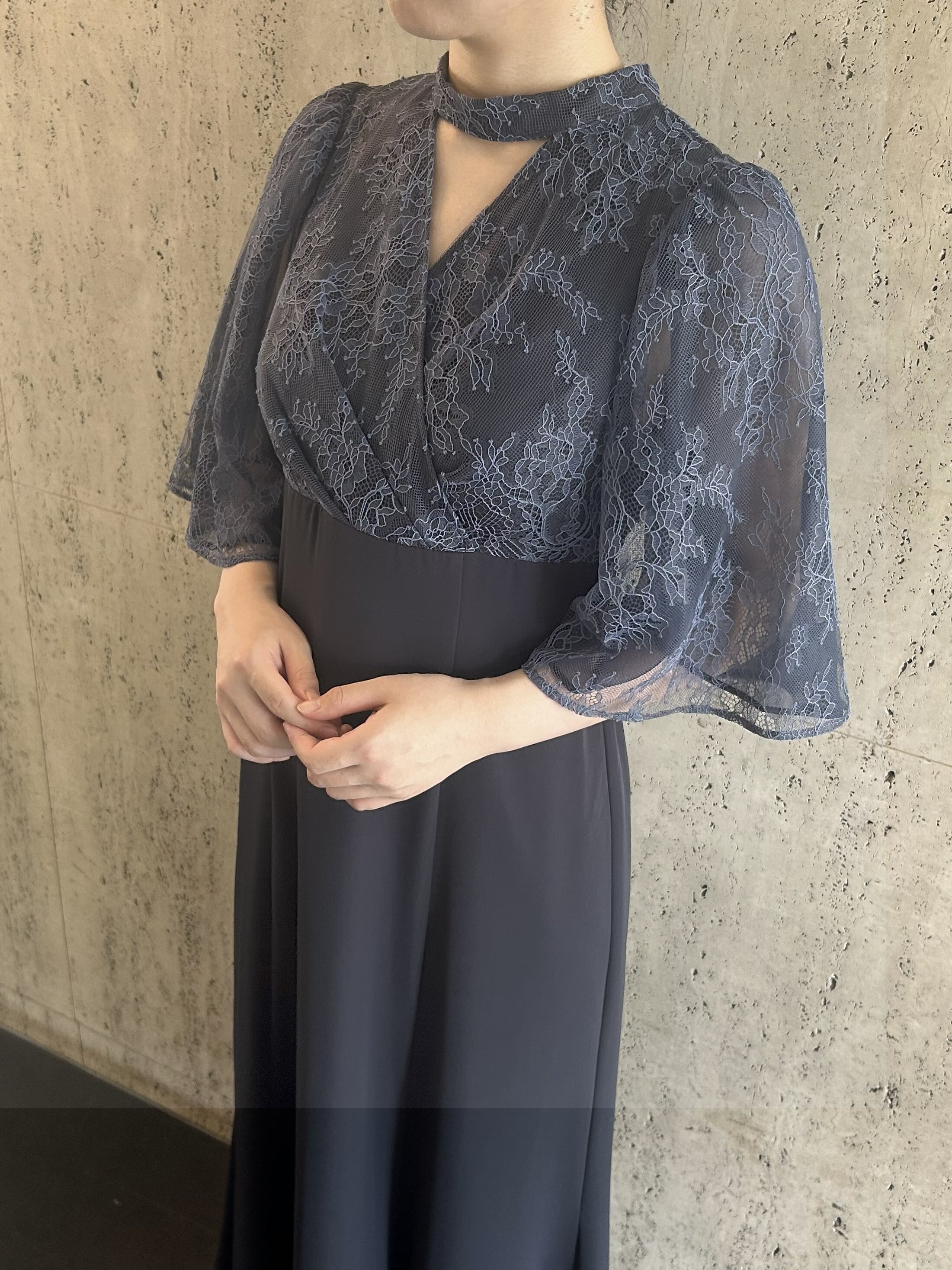繊細なレースを使用したカシュクールに、クラシカルなスタンドネックを付けて、デコルテにトライアングルの上品な肌見せがデザインポイントです。