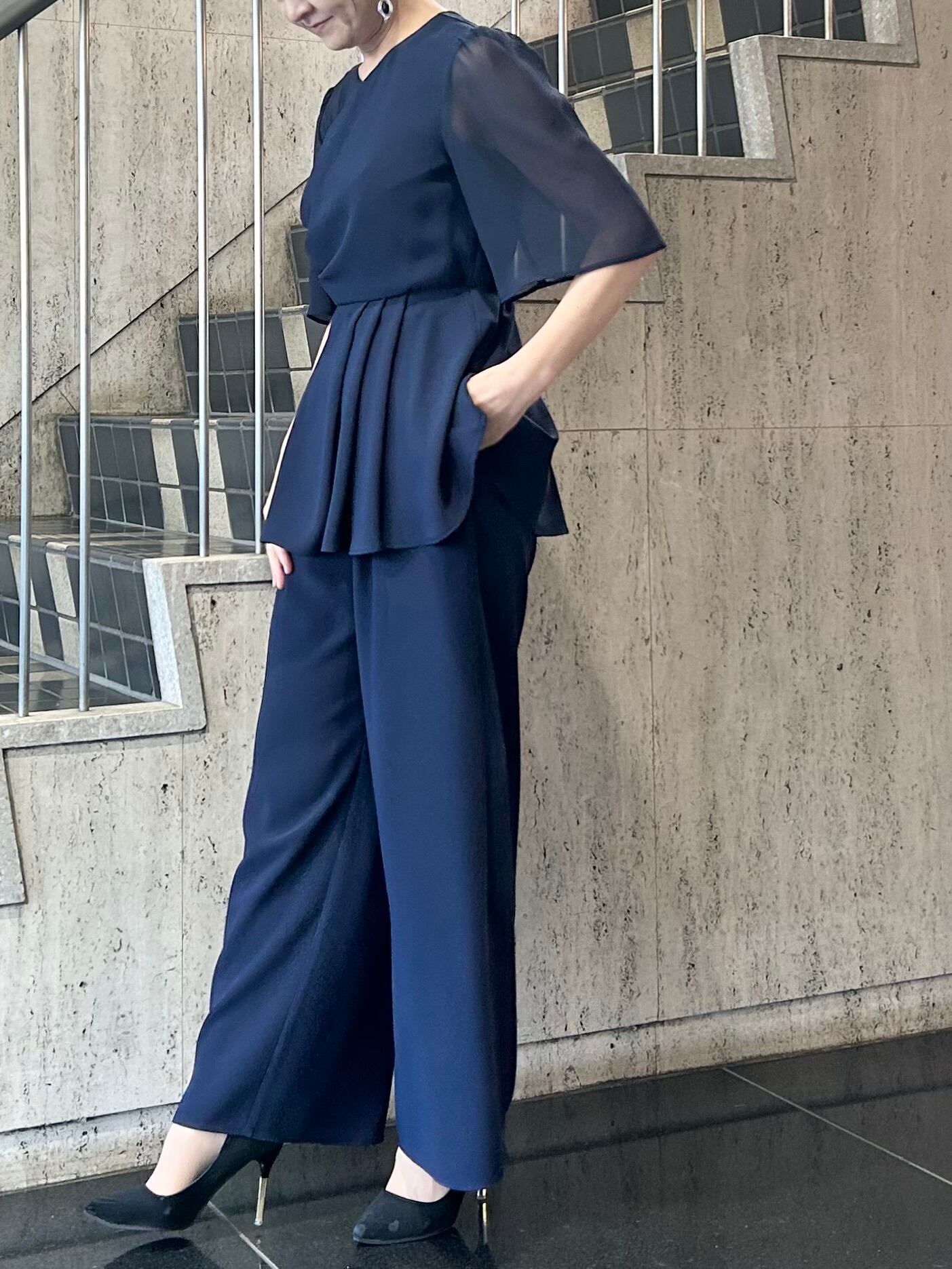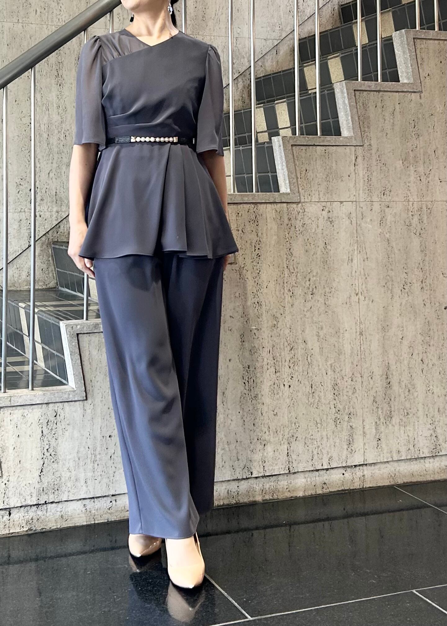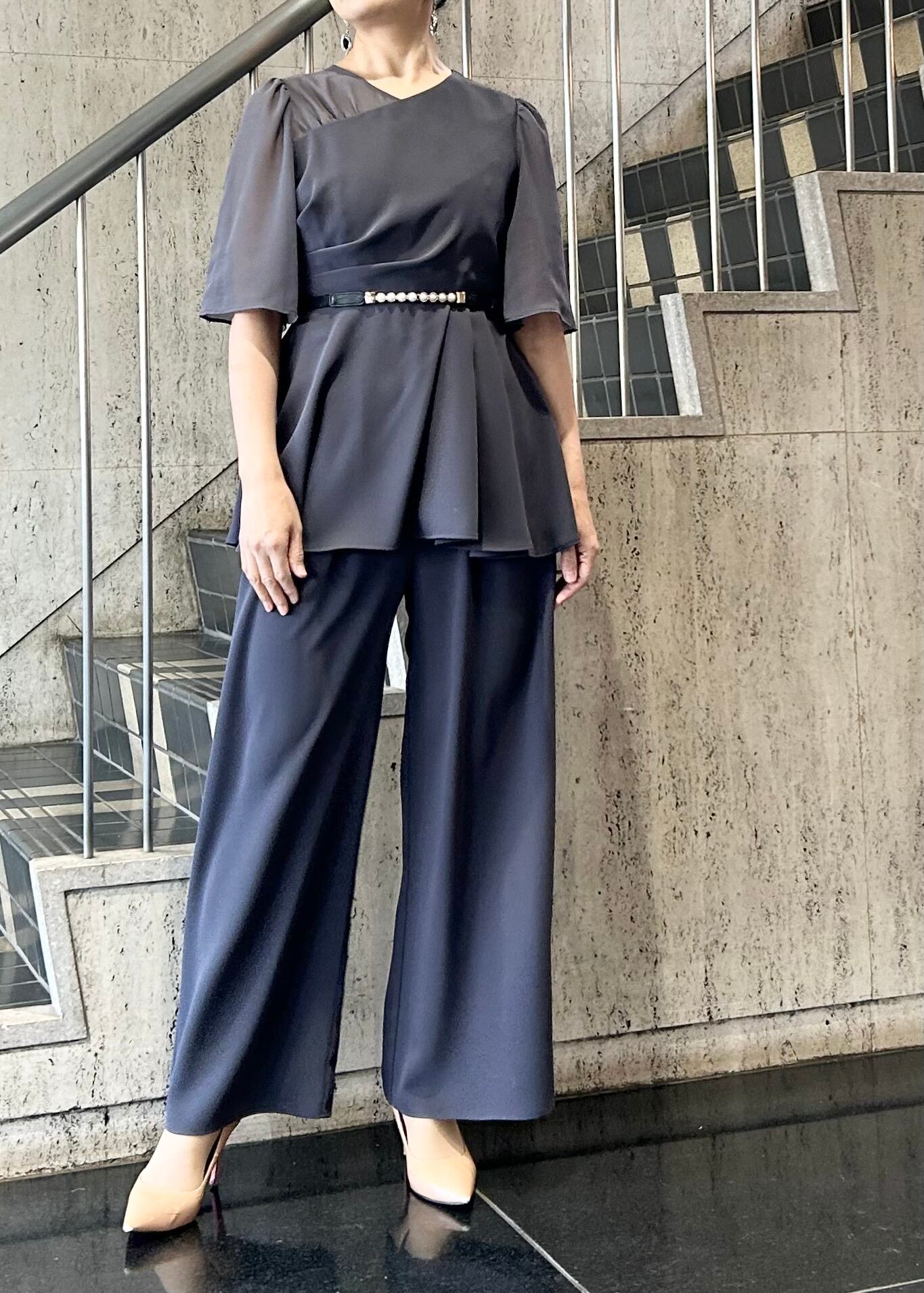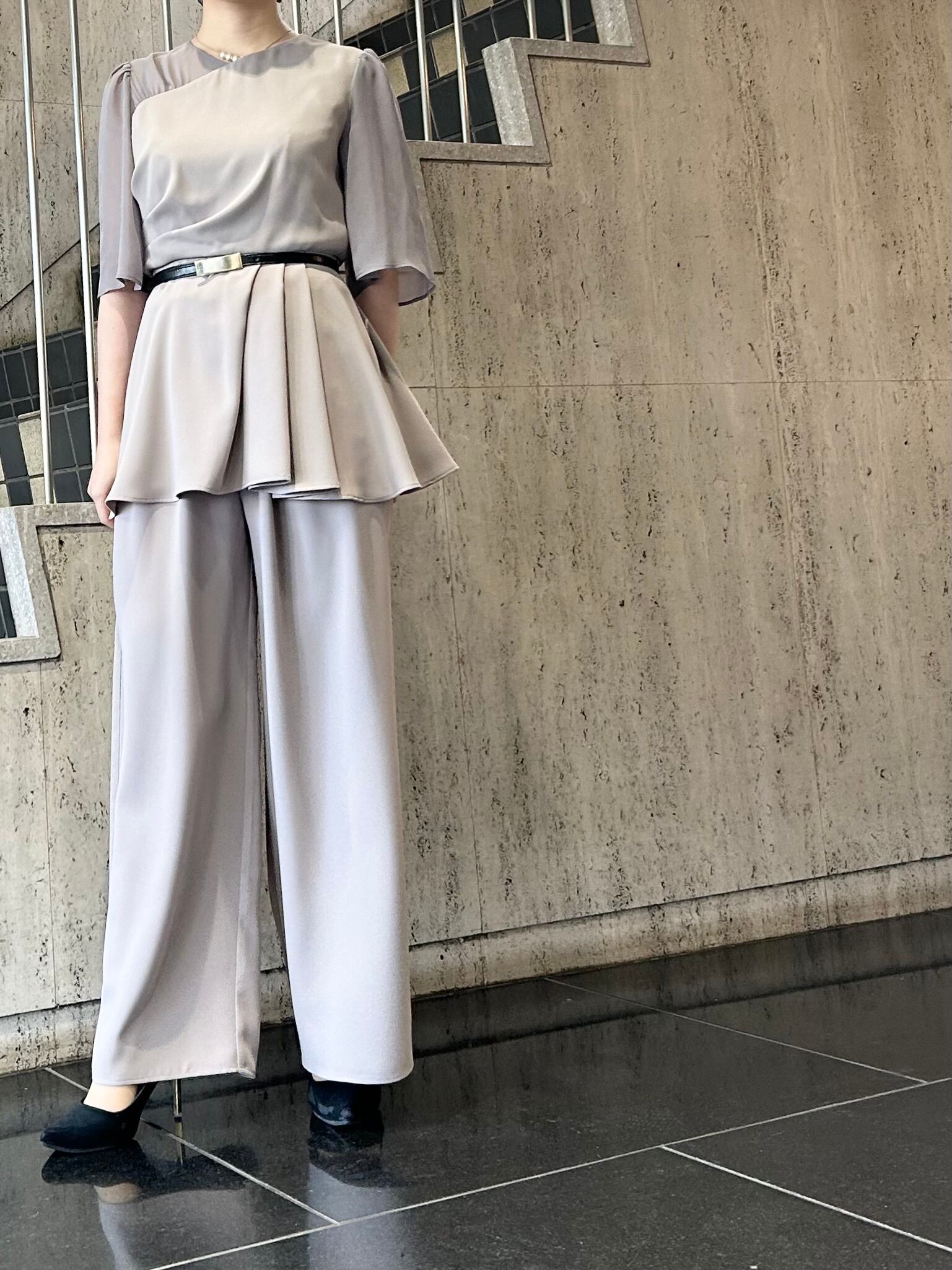 アシンメトリータックドレープのペプラムトップスとワイドパンツのセットアップです。