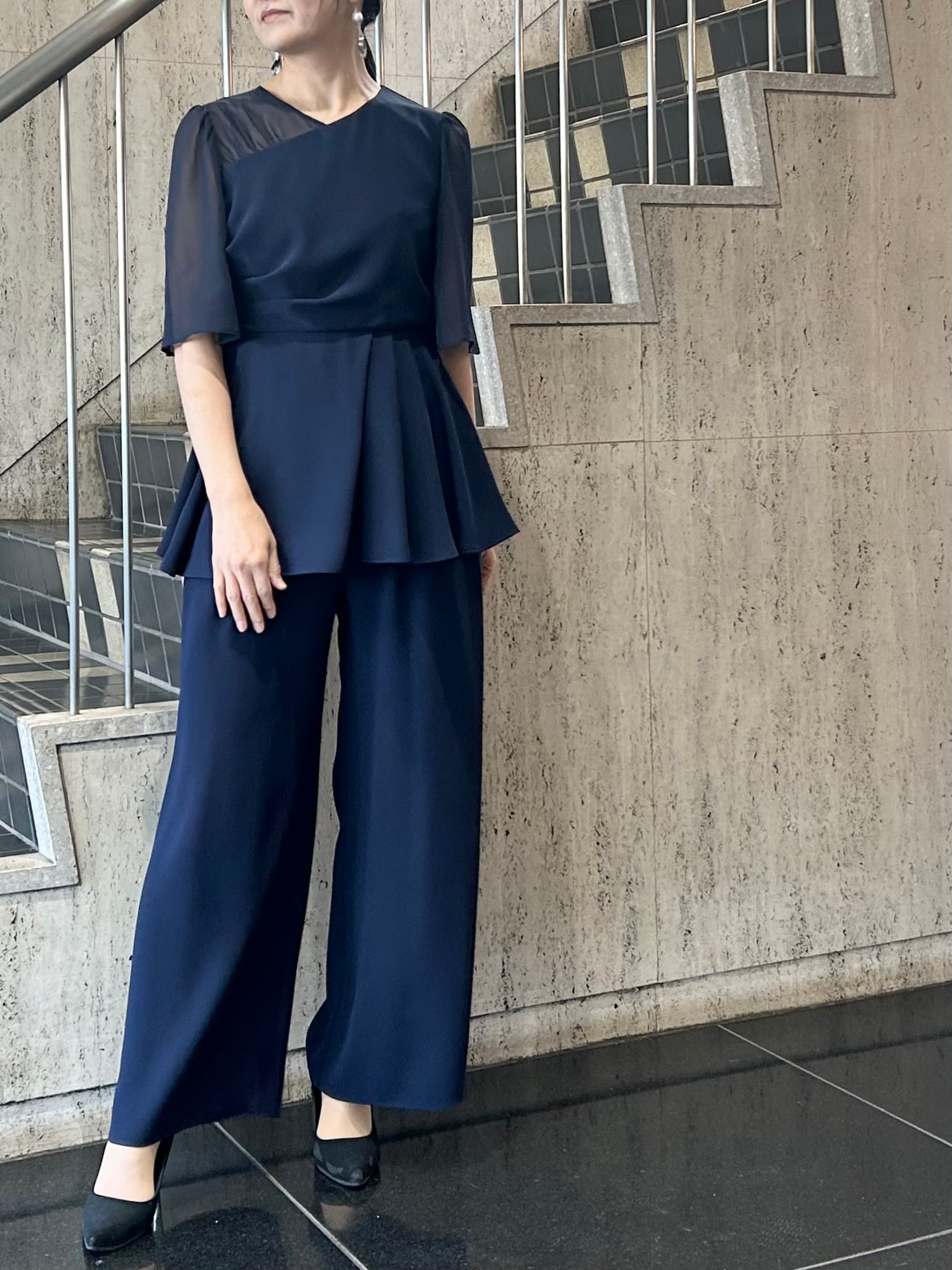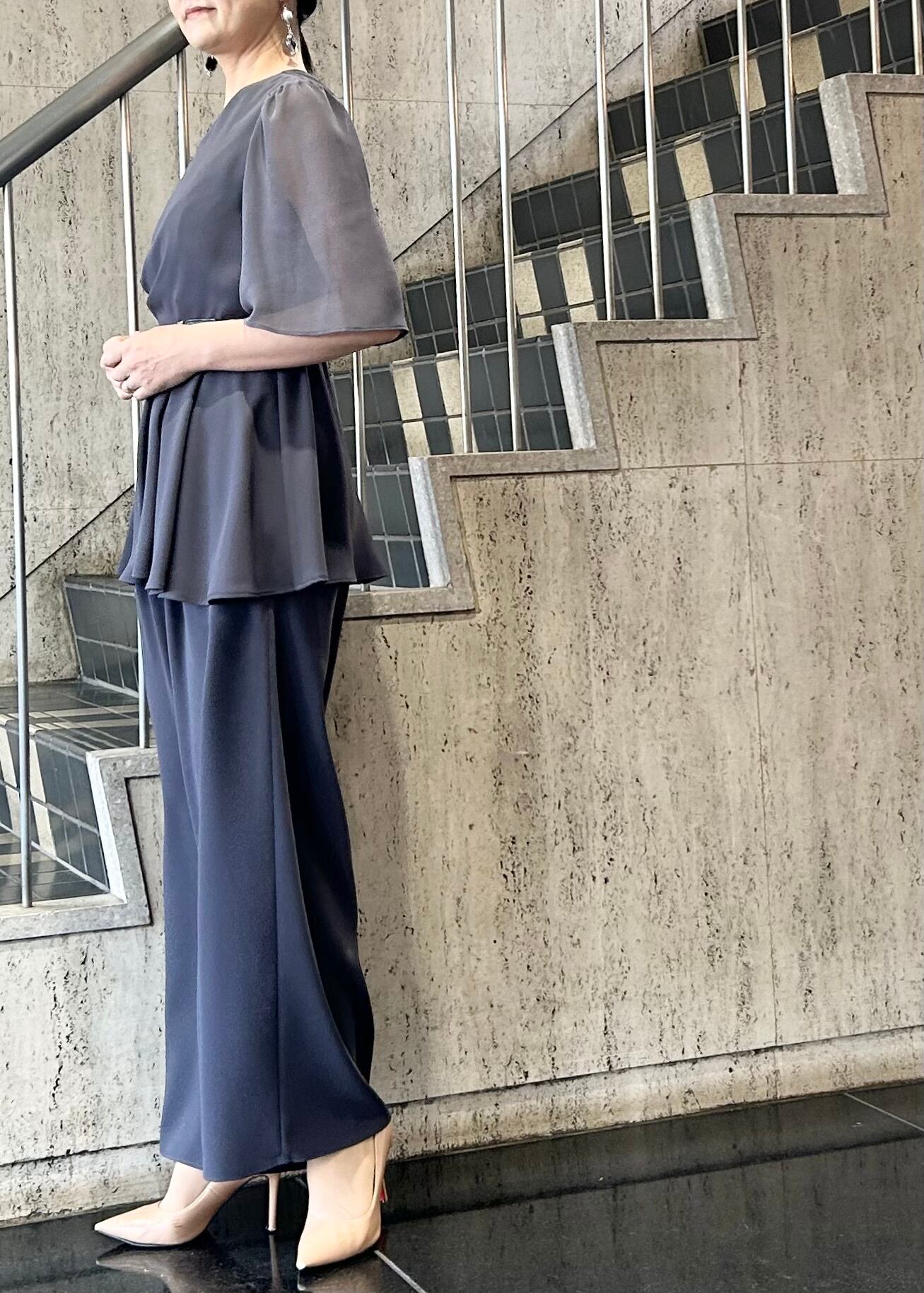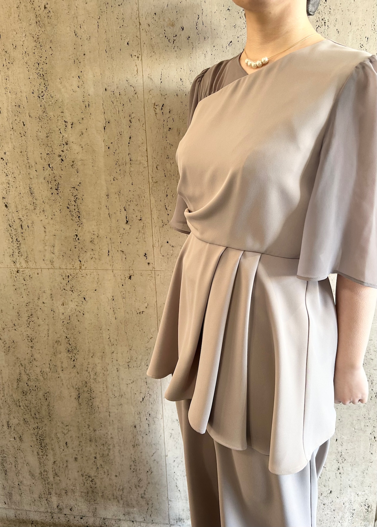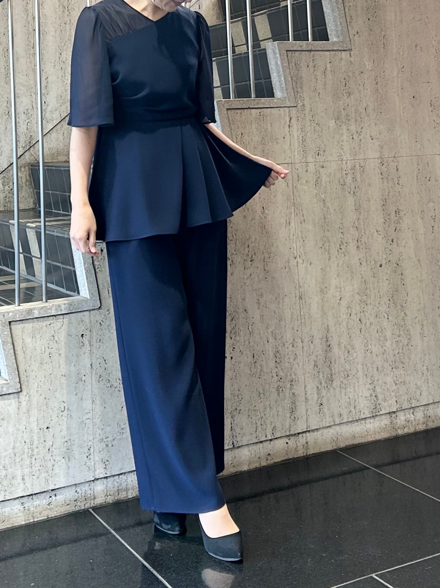 アシンメトリータックドレープのペプラムトップスとワイドパンツのセットアップです。