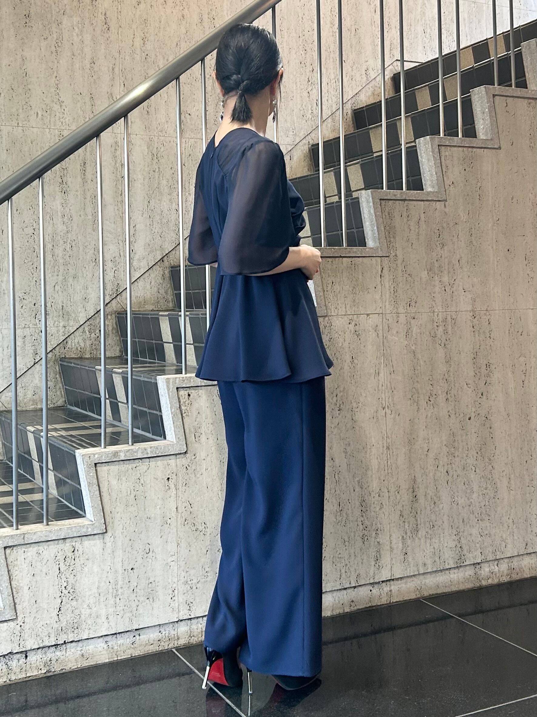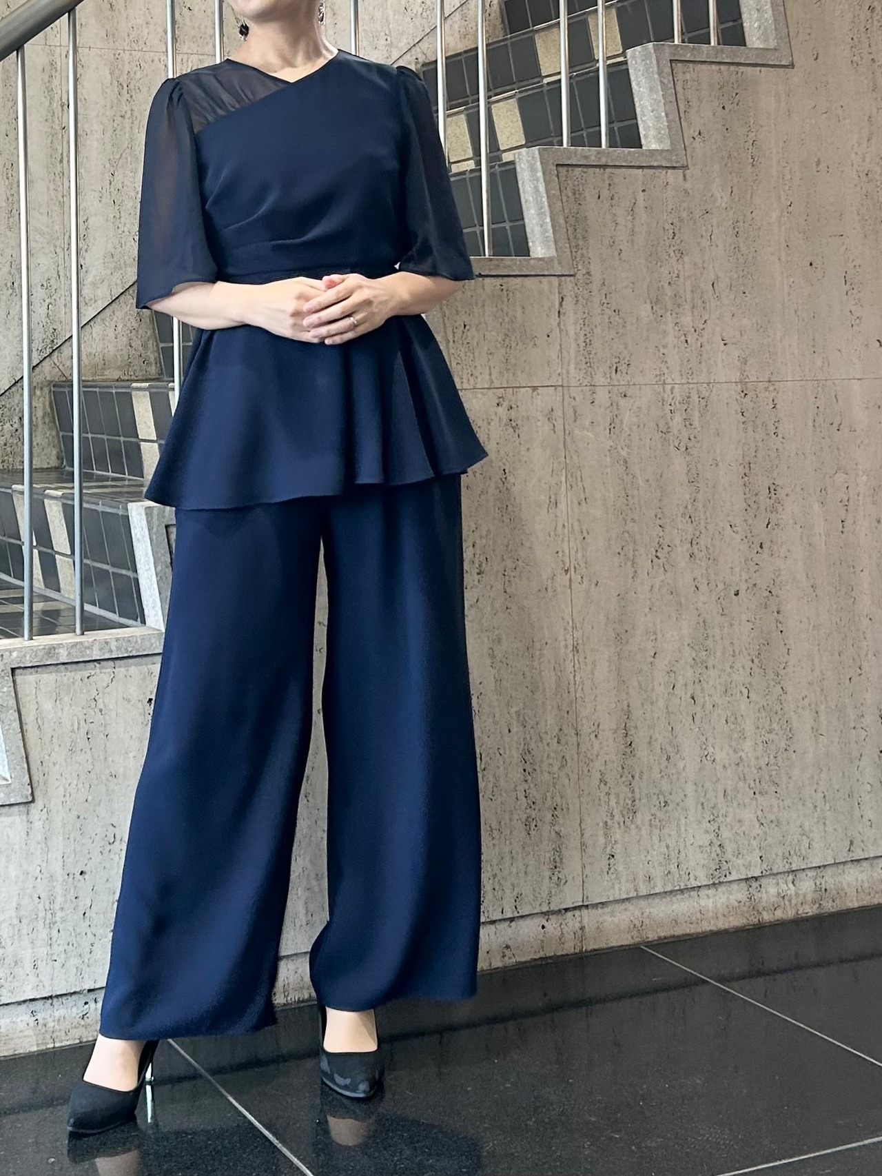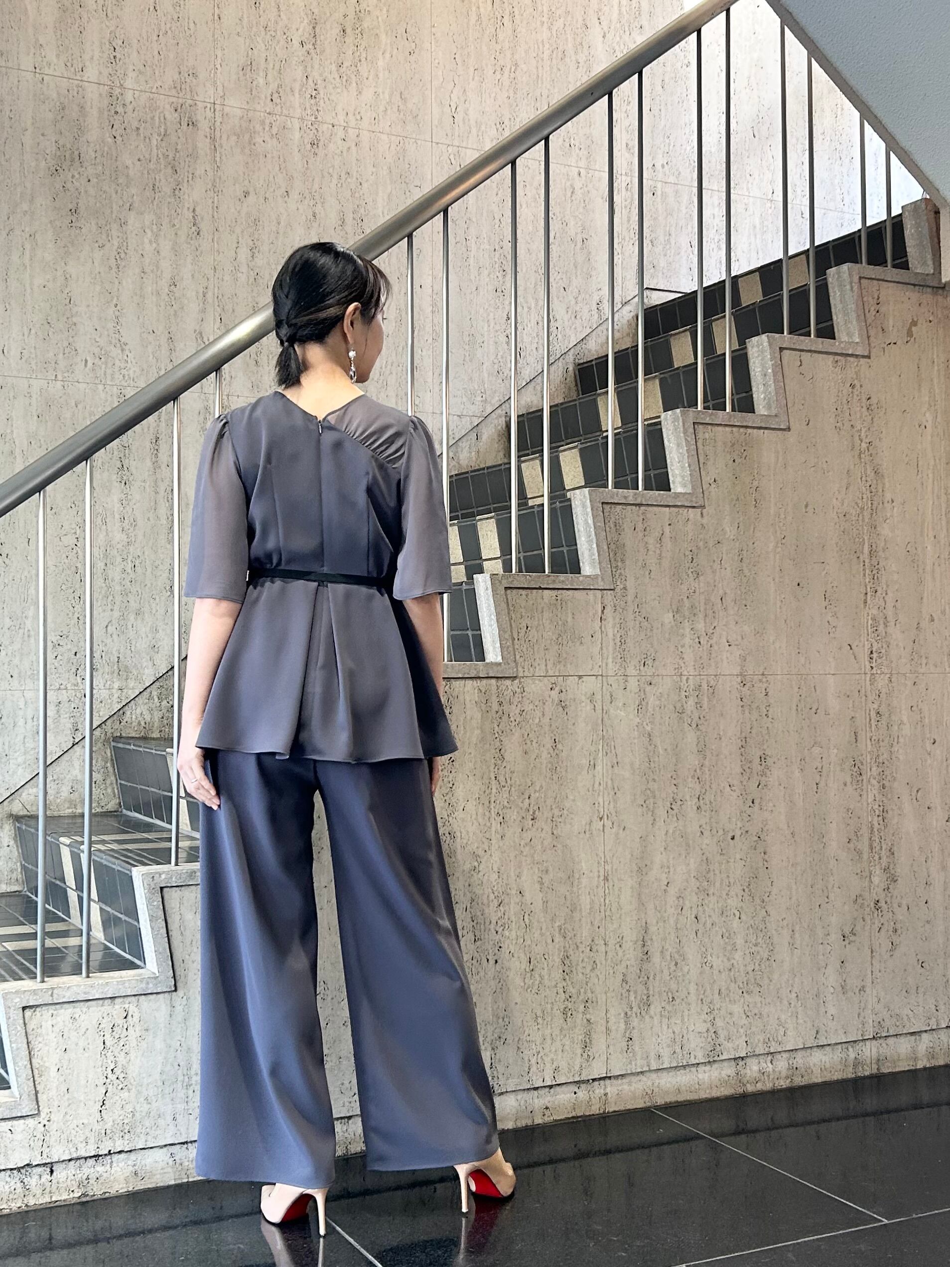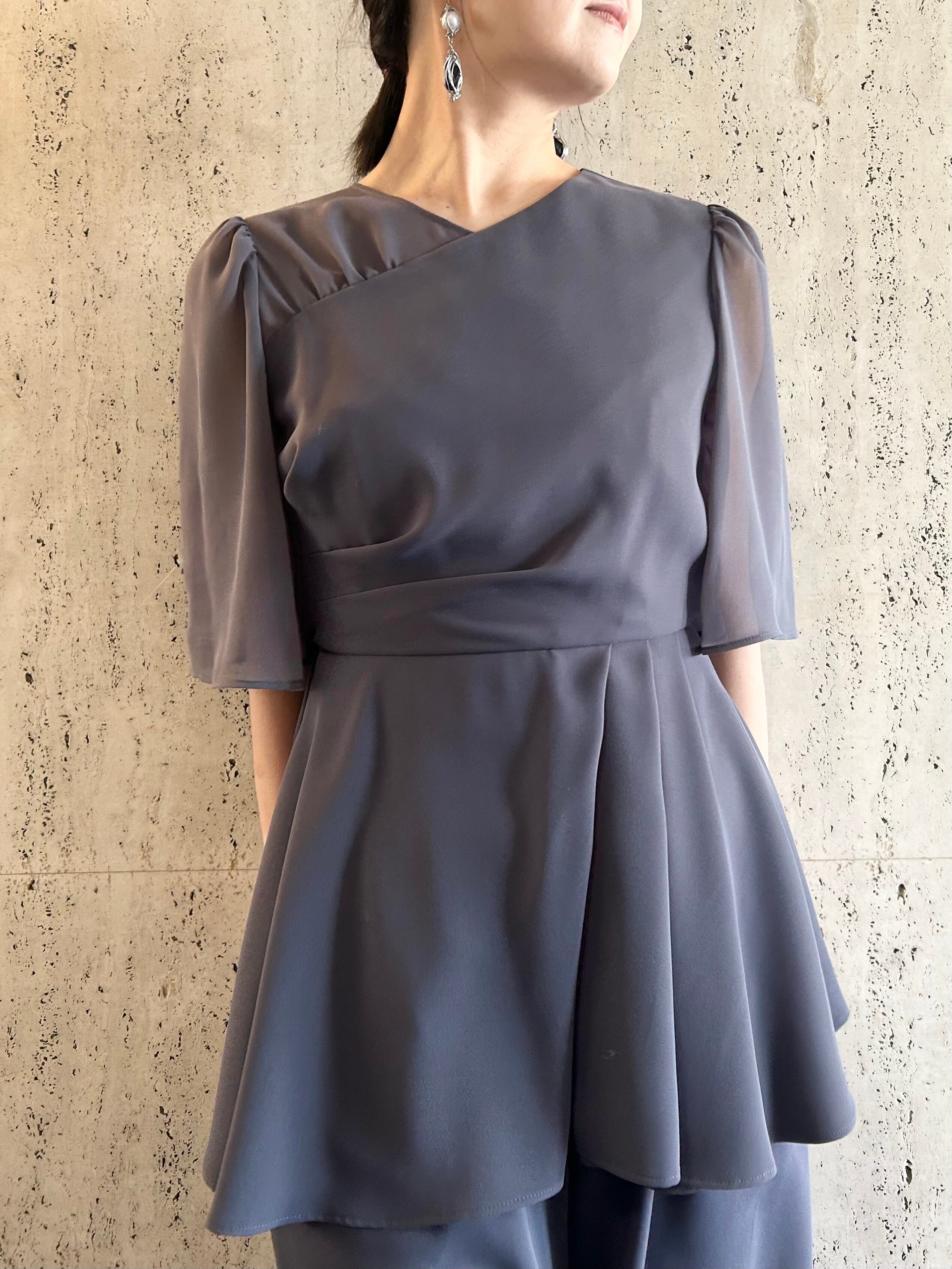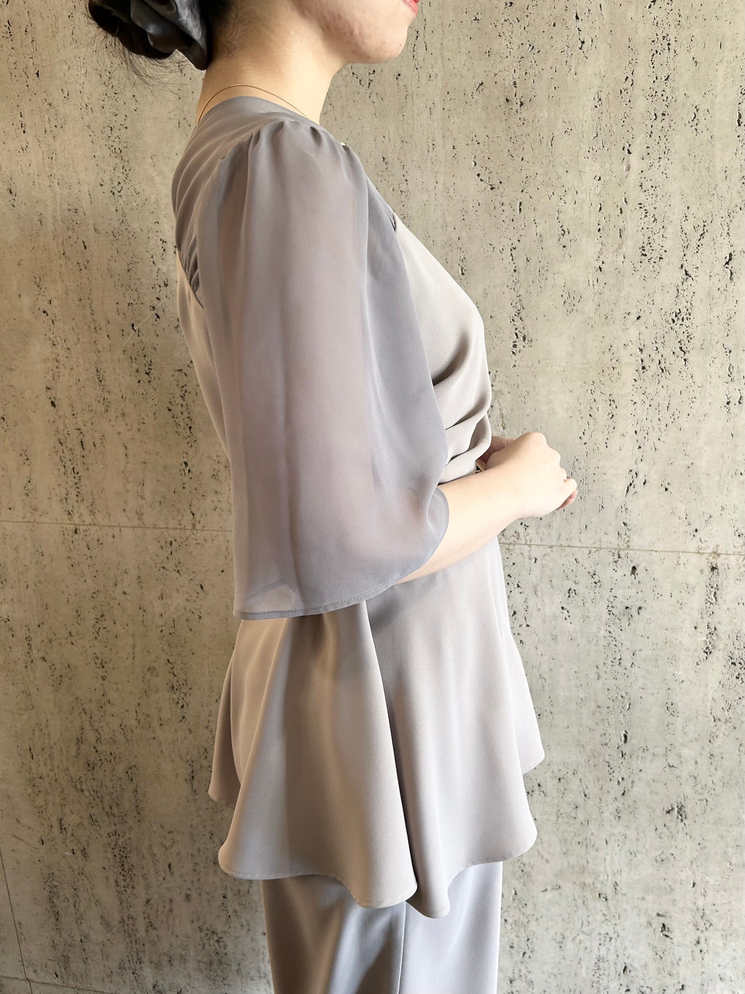 アシンメトリータックドレープのペプラムトップスとワイドパンツのセットアップです。