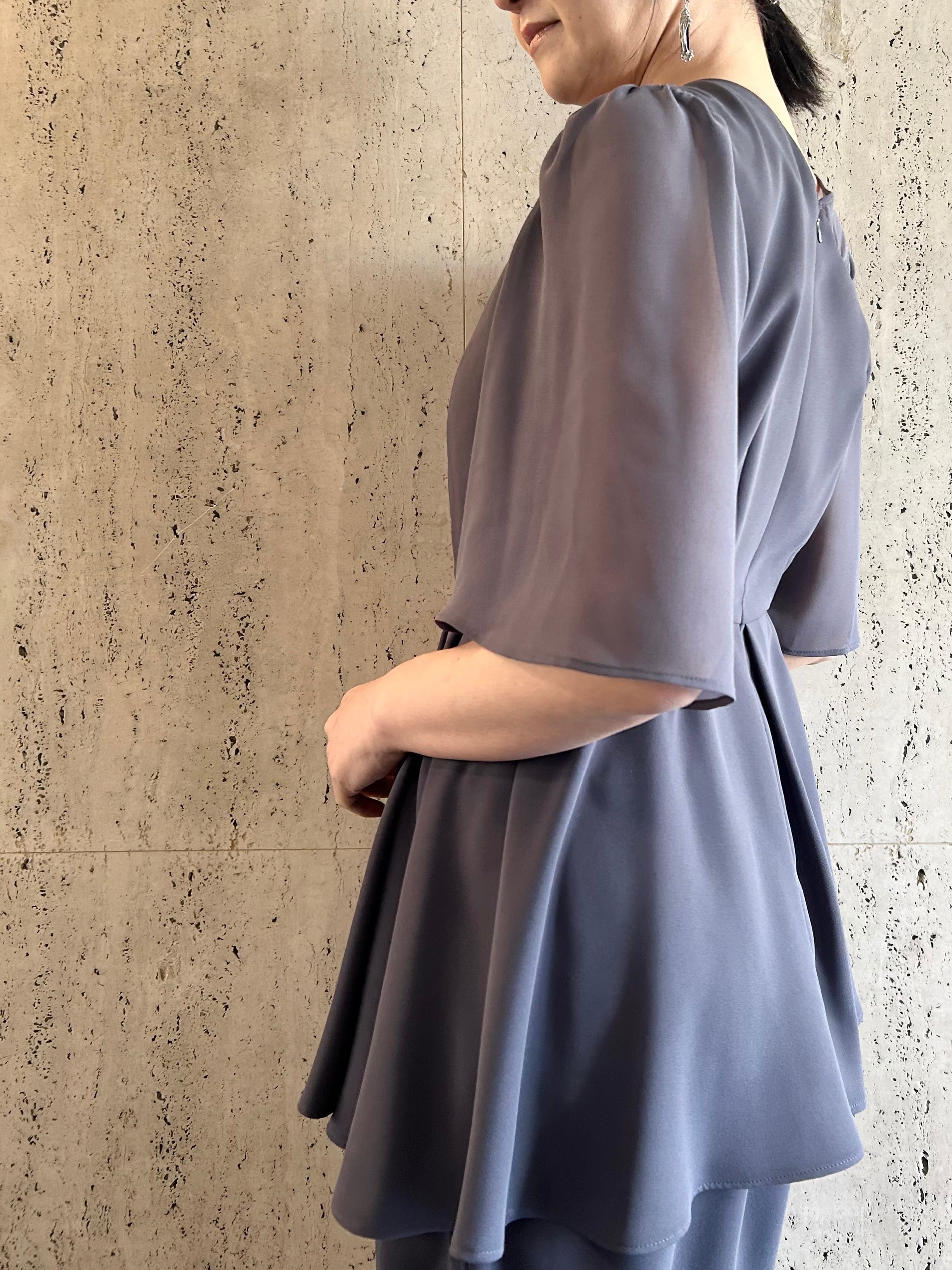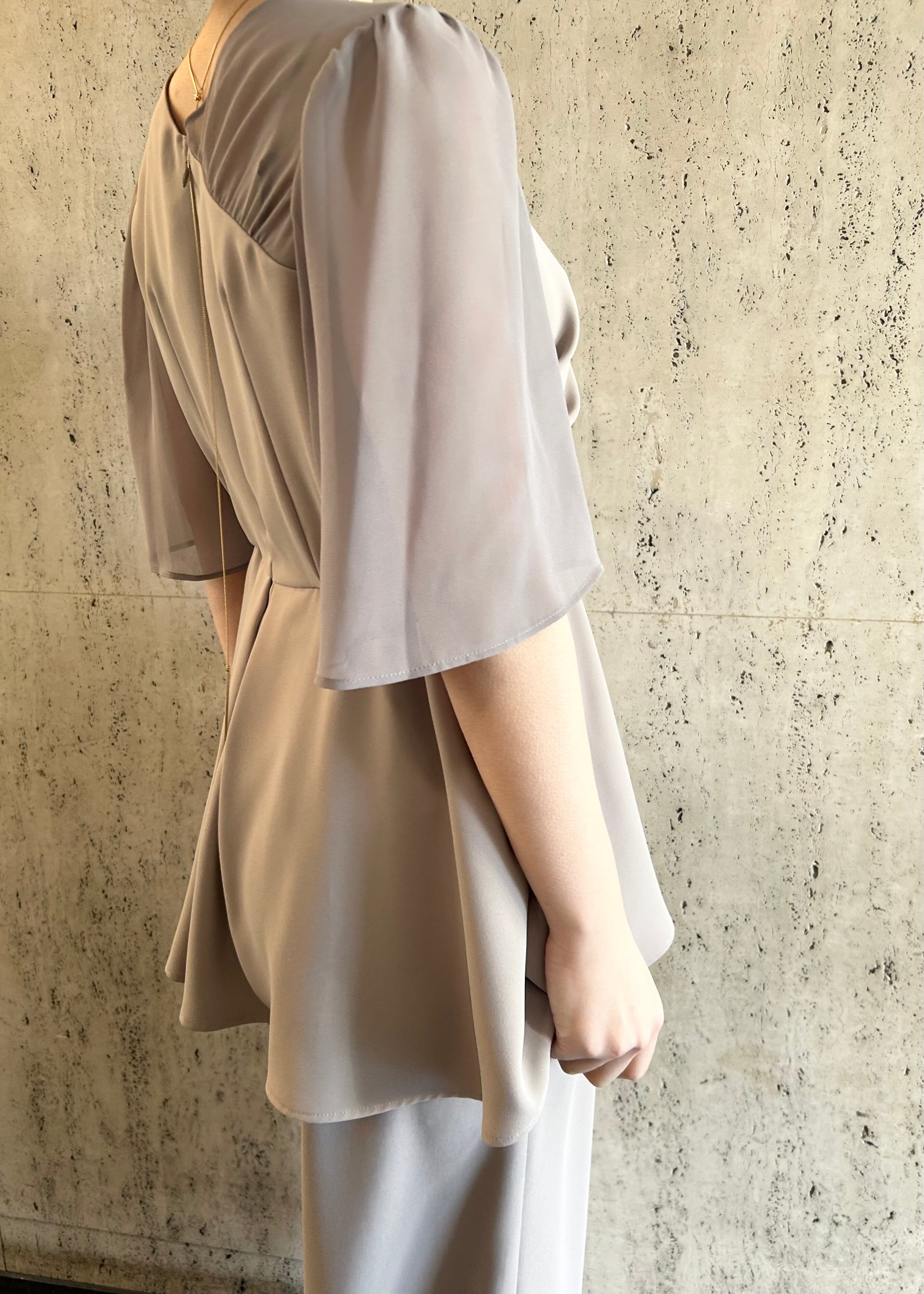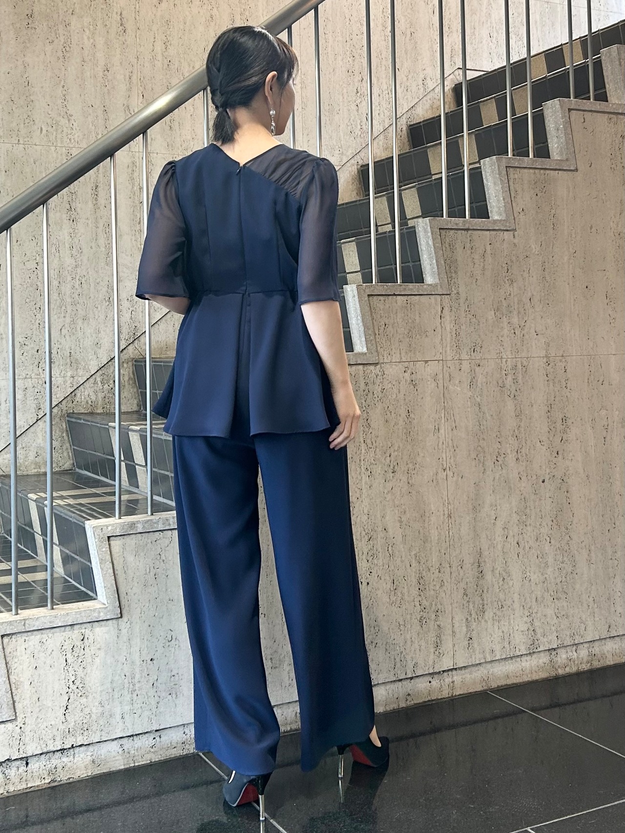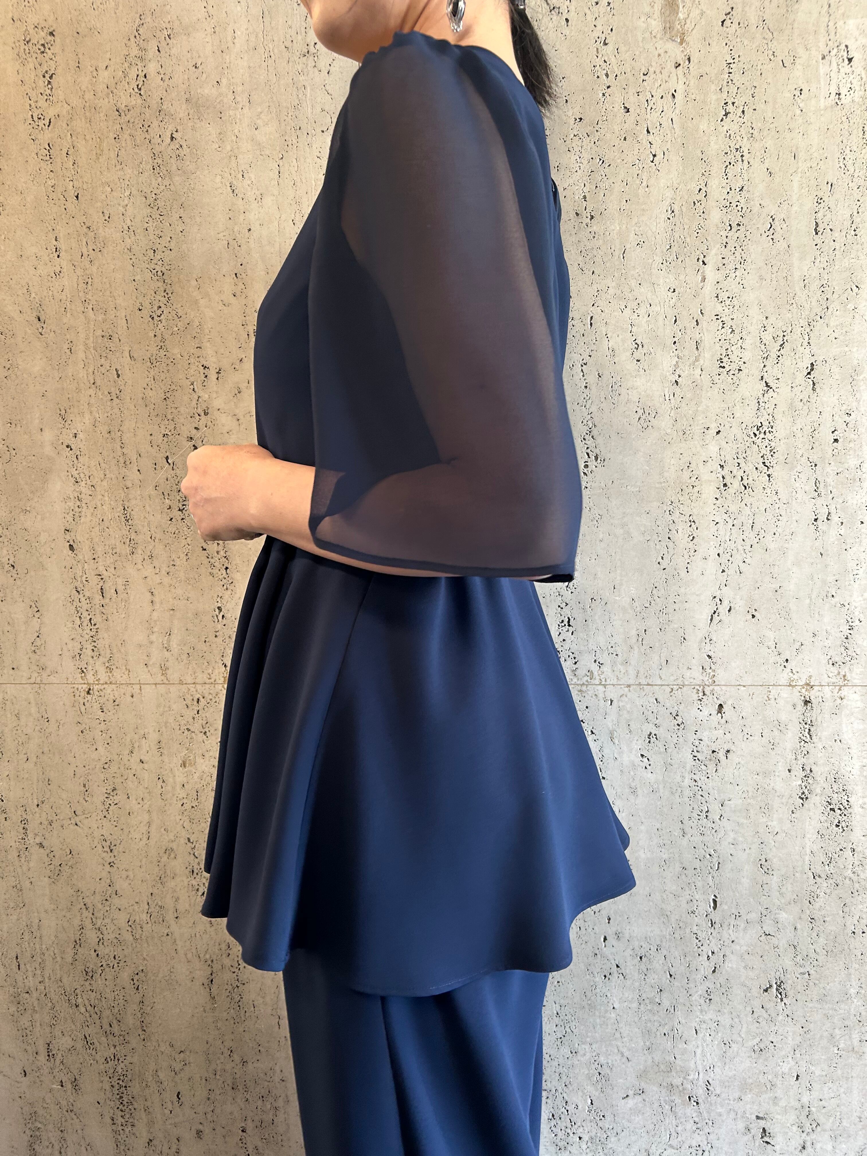 アシンメトリータックドレープのペプラムトップスとワイドパンツのセットアップです。