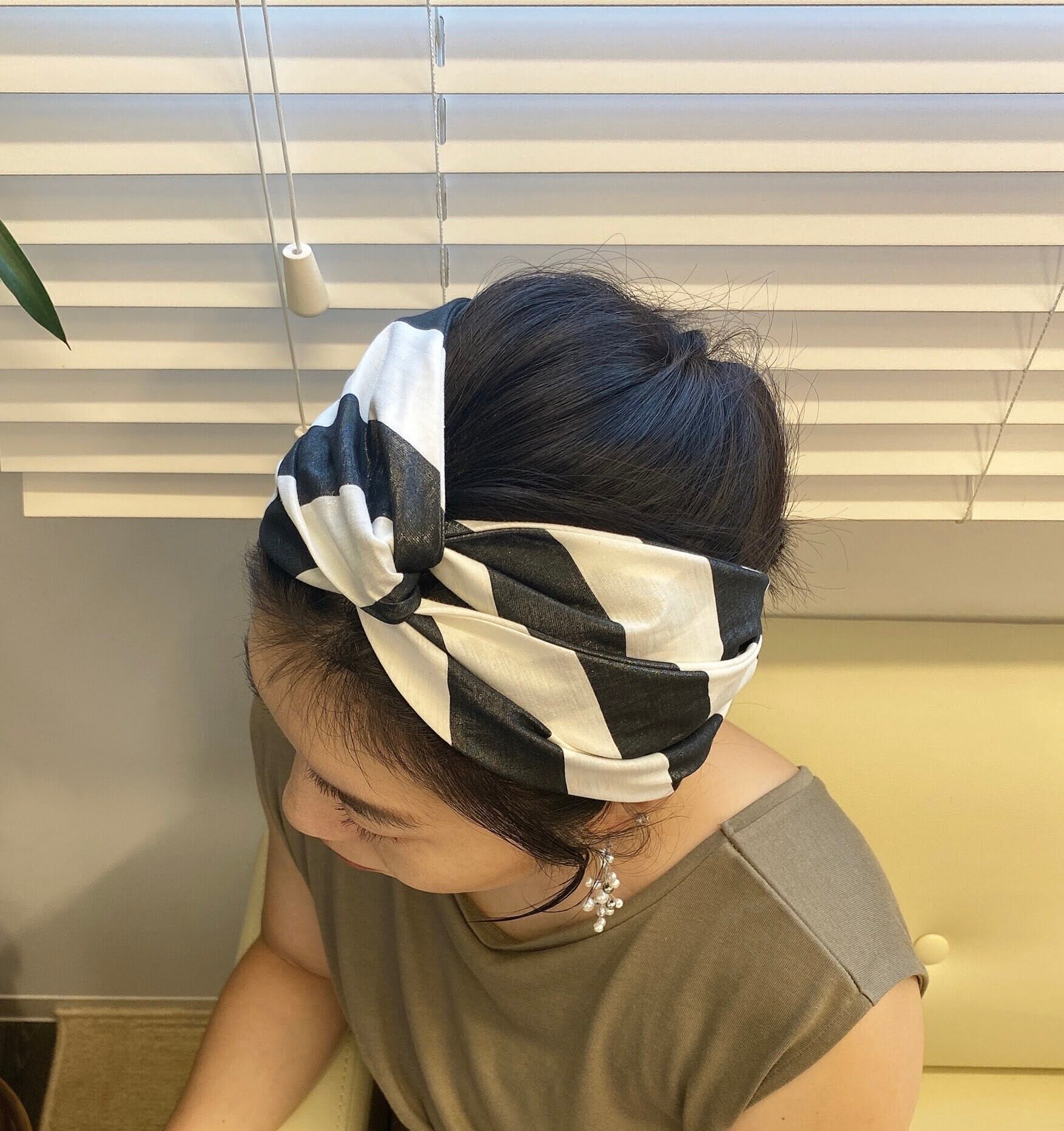 光沢のある生地にボーダー柄がモードな印象のターバンです。