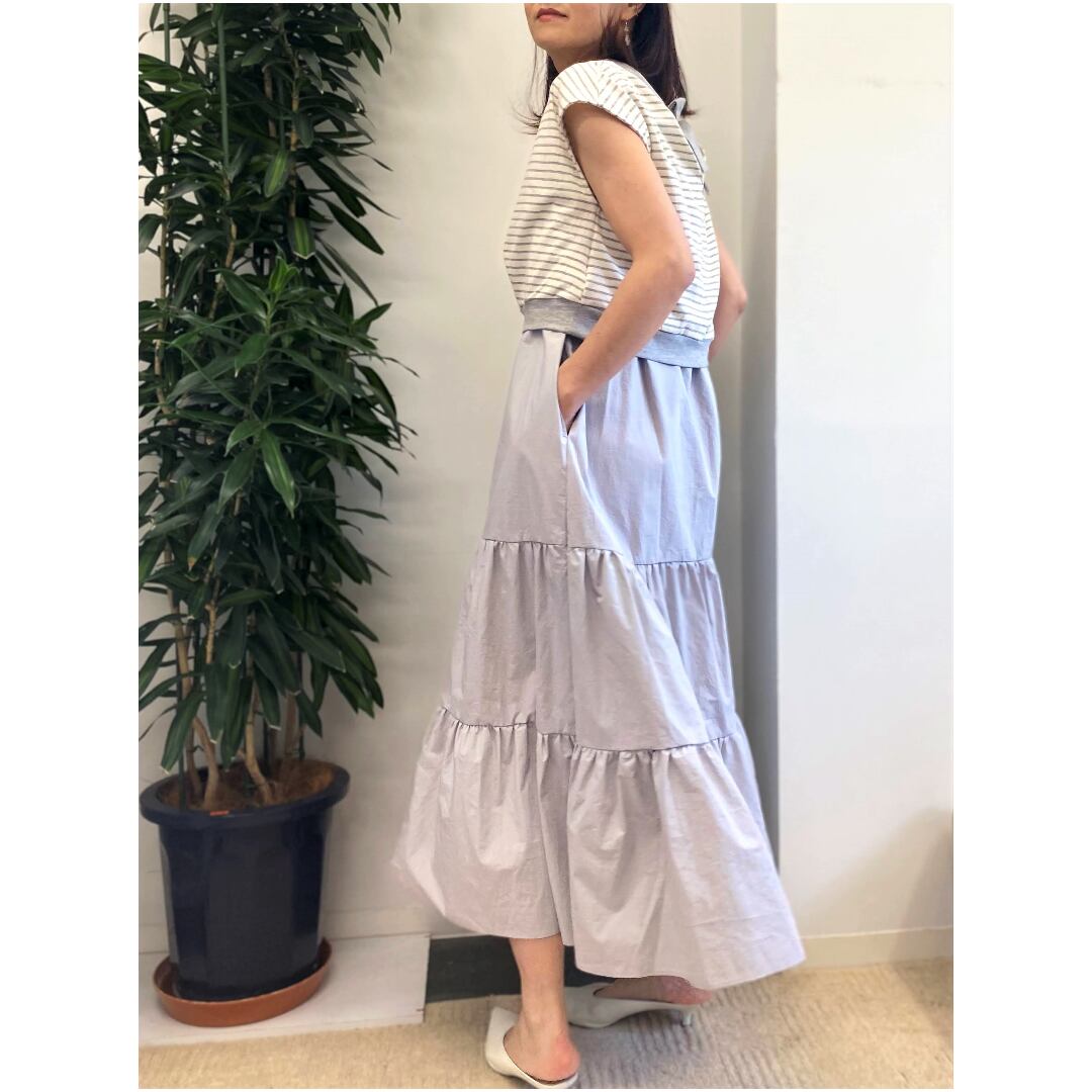 Aラインのティアードワンピースはサラッとし、ポケット付きで1枚でも着用できます。