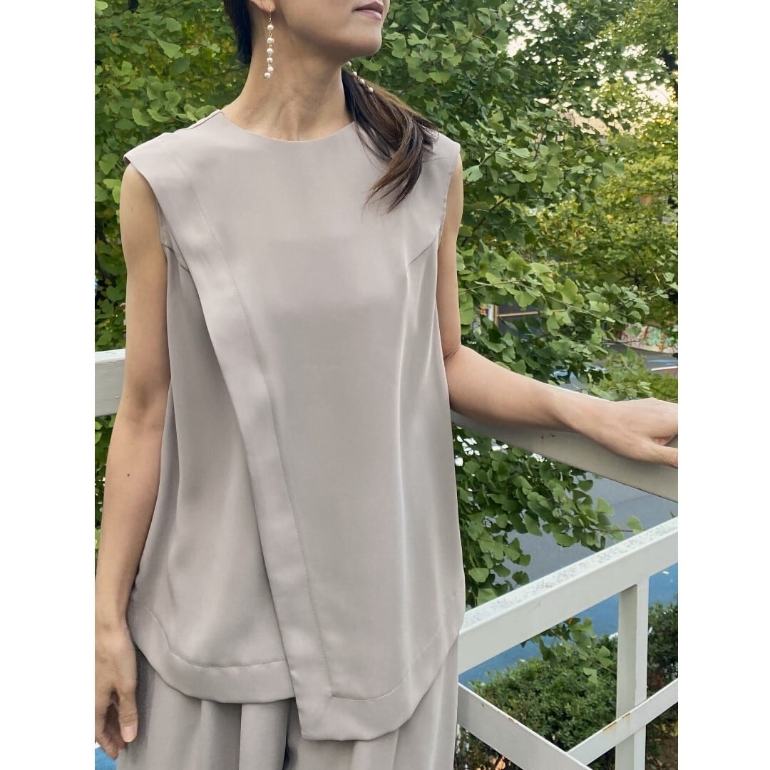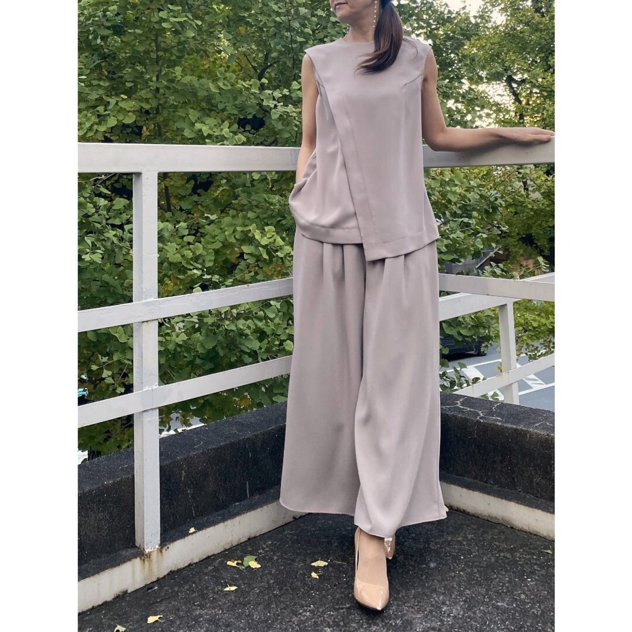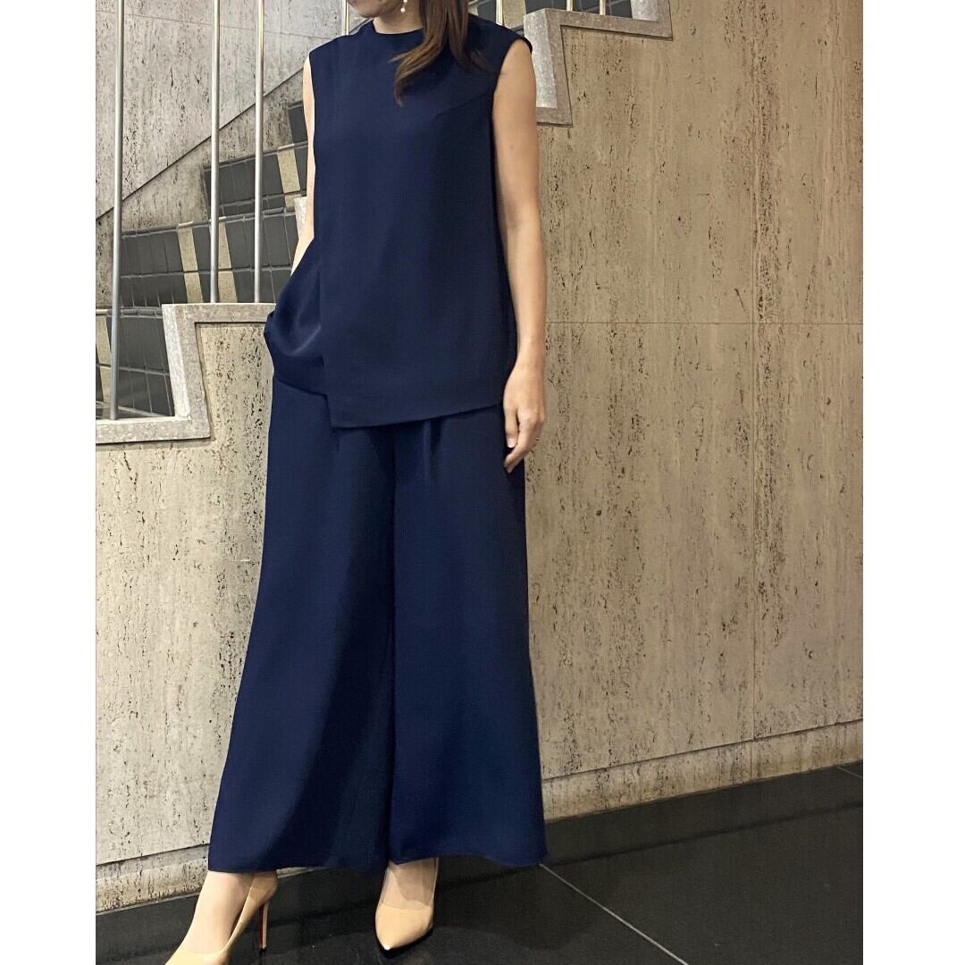 アシンメトリーなレイヤージレとワイドパンツのセットアップ